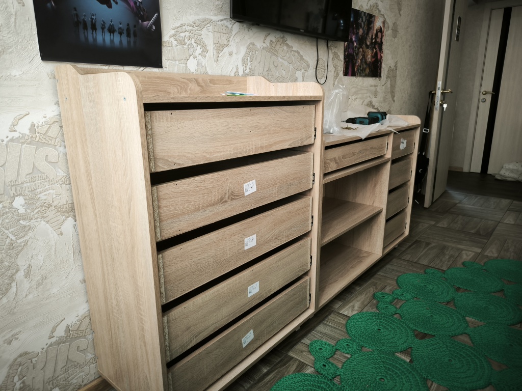 По опыту с компьютерным столом знал, что сборку надо начинать с получения цветной схемы, т.к. с приложенным чертежом ничего не получится. Отдельная история - это доставка, где экспедитор не знает количество упаковок, однако все прошло гладко.В итоге я разложил все детали по двум отдельным кучкам, соответствующие каждому комоду. Выяснилось, что даже на цветной схеме не указано 3 позиций, пришлось обращаться в гарантийный отдел. Собрал довольно быстро, благо есть опыт сборки мебели. В целом комоды понравились, есть конечно некоторые недочёты. Кстати, для ножек (которых 9) нет подпятников, чтобы не царапать пол