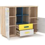 Комод Уэстер 2 BMS непременно понравится детям ярким дизайном и возможностью компактно разместить любимые игрушки и книги, принадлежности для творчества или спорта. Широкая комбинированная модель объединила глухие распашные отделения с полками, два выдвижных ящика и открытые секции разных размеров. В оформлении комода использованы древесные тона, желтый, белый и бирюзовый глянец, роль декора играют накладные ручки. Купить комод Уэстер 2 BMS приглашаем к нам в интернет-магазин.
