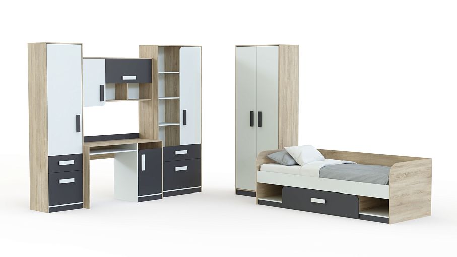 Детская Фантазия BMS – практичный модульный комплект современного яркого дизайна с оригинально закругленными фасадами. В детской учтены все требования к качеству и безопасности материалов, а разнообразие входящих в комплект элементов позволит полностью оборудовать помещение. Стол с выдвижной полкой для клавиатуры и тумбой дополнен навесной полкой, пеналом и комбинированным шкафом для хранения школьных и спортивных принадлежностей. В основании кровати – бельевой ящик и ниши, для одежды предусмотрен просторный двухдверный шкаф. Купить детскую Фантазия BMS вы сможете в нашем интернет-магазине.