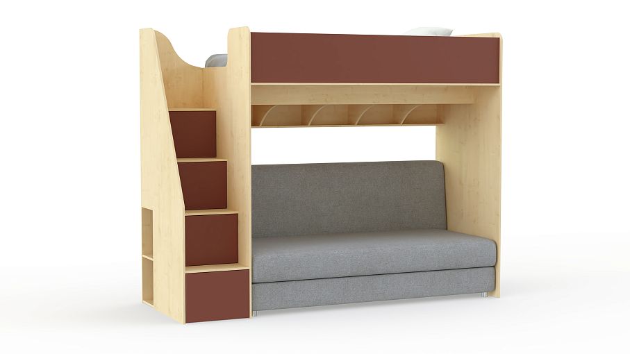 Кровать с диваном Пример 18 BMS с фасадами в ярком терракотовом оттенке гармонично дополнит интерьер современной девичьей спальни. Верхний ярус оборудован просторным спальным местом с бортиком, а на нижнем располагаются книжные полки с перегородками и раскладной диван. Практичным дополнением композиции станет лестница-комод с вместительными отделениями для книг и игрушек. Купить кровать с диваном Пример 18 BMS и выгодно задействовать пространство вам поможет наш интернет-магазин.