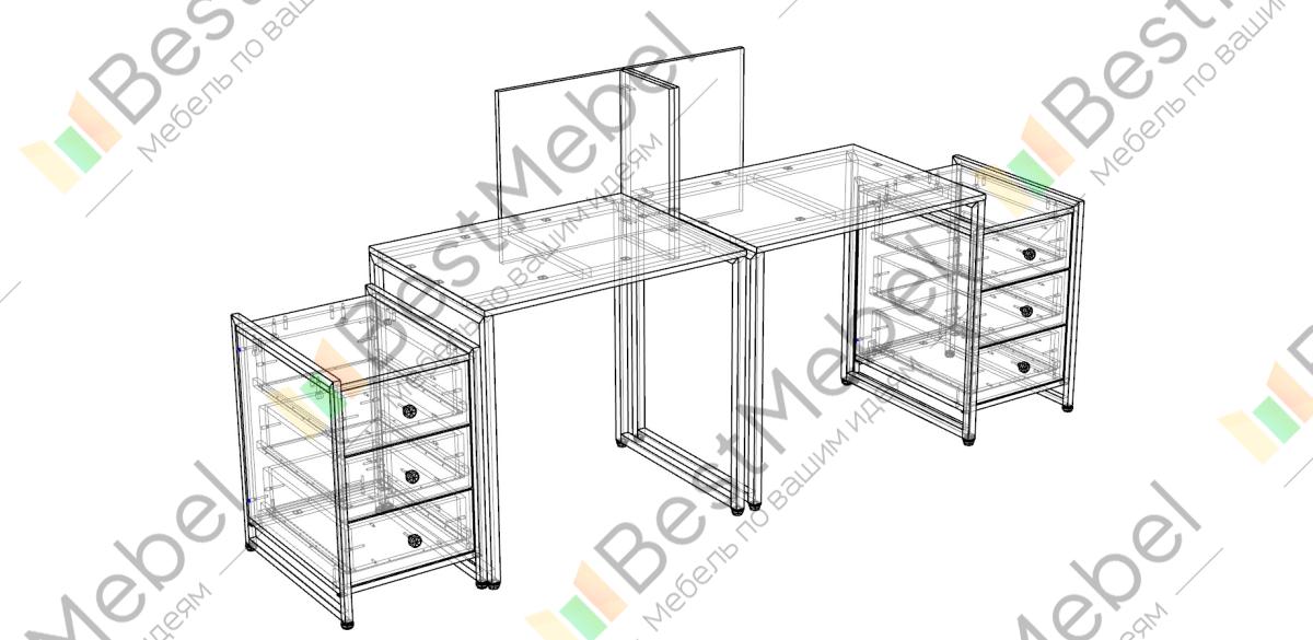 Офисный комплект Женева 15 BMS - это два письменных стола с угловыми перегородками и две стационарные тумбы для бумаг и оргтехники. Глухие экраны из ламинированной плиты создают индивидуальное пространство для каждого сотрудника и дополнительно служат для размещения канцелярских мелочей. Дизайн с элементами лофта прекрасно подходит для оформления современного офиса. Купить офисный комплект Женева 15 BMS в любых размерах и оттенках из нашего каталога вы сможете на сайте интернет-магазина.