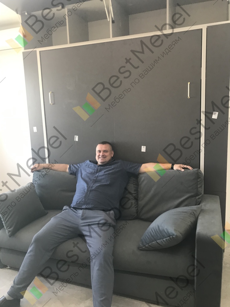 Сделал заказ в середине ноября. Очень долго делали, что то постоянно не было на производстве, то нужного цвета, то ткани. В итоге заказ пришёл через 2,5 месяца в начале февраля. Приехал в полной комплектации, кроме понижающего трансформатора, который по рекламации подвезли позже, через неделю, но на сборку это не влияло. Сам шкаф удобный,внутри при раскинутой кровати есть полки под разные мелочи и шкафчики. Я сделал проводку к каждой стороне и вывел розетки и светильники, очень функционально, можно ставить телефоны на зарядку, что бы под боком были. Верхние ящики-антресоли вмещают подушки и пледы, но так как у нас высота потолков не позволяла заказать в полную высоту, то газлифты на дверцы установить не подразумевалось конструкцией (о чём меня предупреждали ещё в наале заказа), и это кстати весьма неудобно, т.к. нужно иметь третью руку, что бы держать крышку, а двумя руками засовывать подушки..Ещё подъёмные газлифты самого корпуса кровати, а именно кронштейны, не вызывают доверия. Но тут как говорится за ваши деньги любой каприз. Я выбрал по умолчанию дешёвые. Есть получше. Советую брать их. Текущие довольно упругие, на подъём тяжеловатые, но жена справляется. Самое непродуманное это большой объём подушек от дивана, которые приходится складировать куда то рядом. Это проблема. У меня есть мысль как заколхозить это, но хотелось бы видеть решение от производителя. В целом я доволен шкафом-кроватью. Кровать была моей мечтой. Потому что две большие комнаты мы отдали детям, там у них творческие мастерские, музыкальные инструменты, а себе оставили маленькую комнатушку 9 кв.метров. И всё время спали на раскладном диване. По этому, когда я увидел эту кровать и её размеры, то я конечно загорелся идеей разместить её в этой комнате. И у меня получилось!