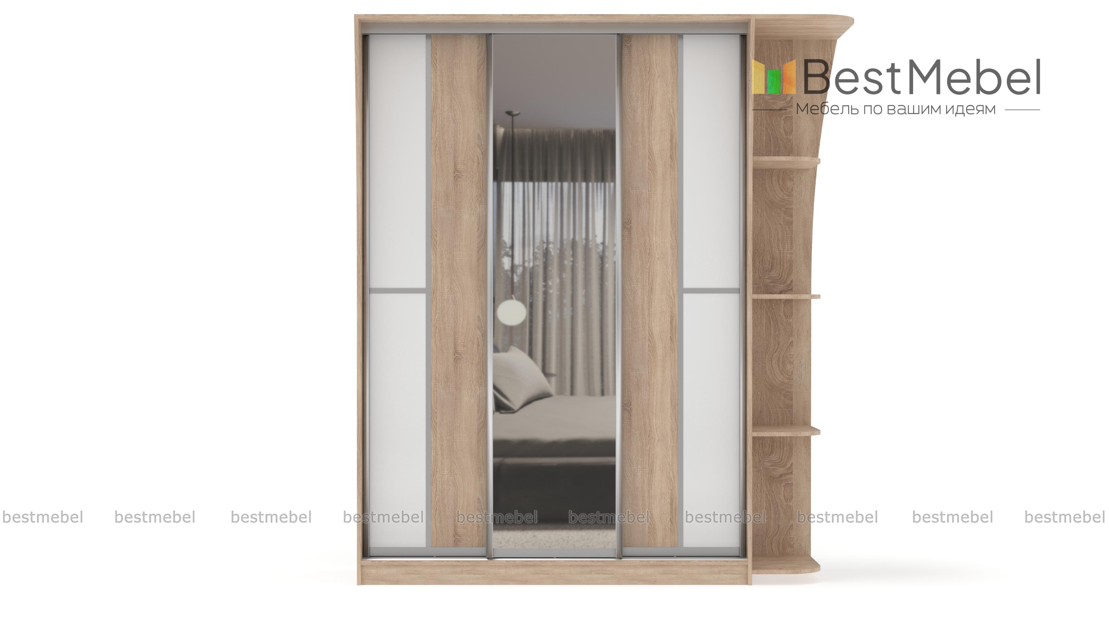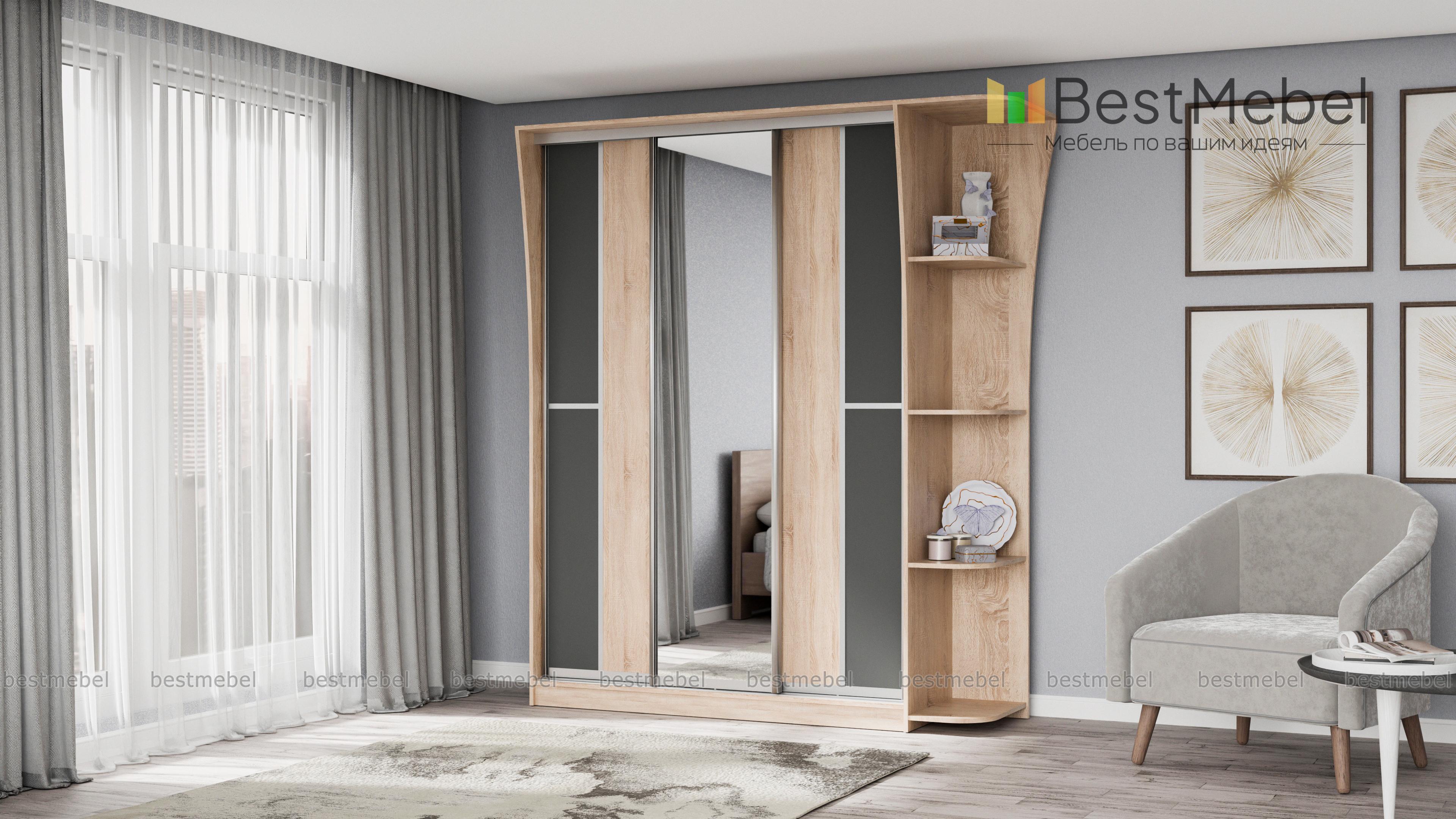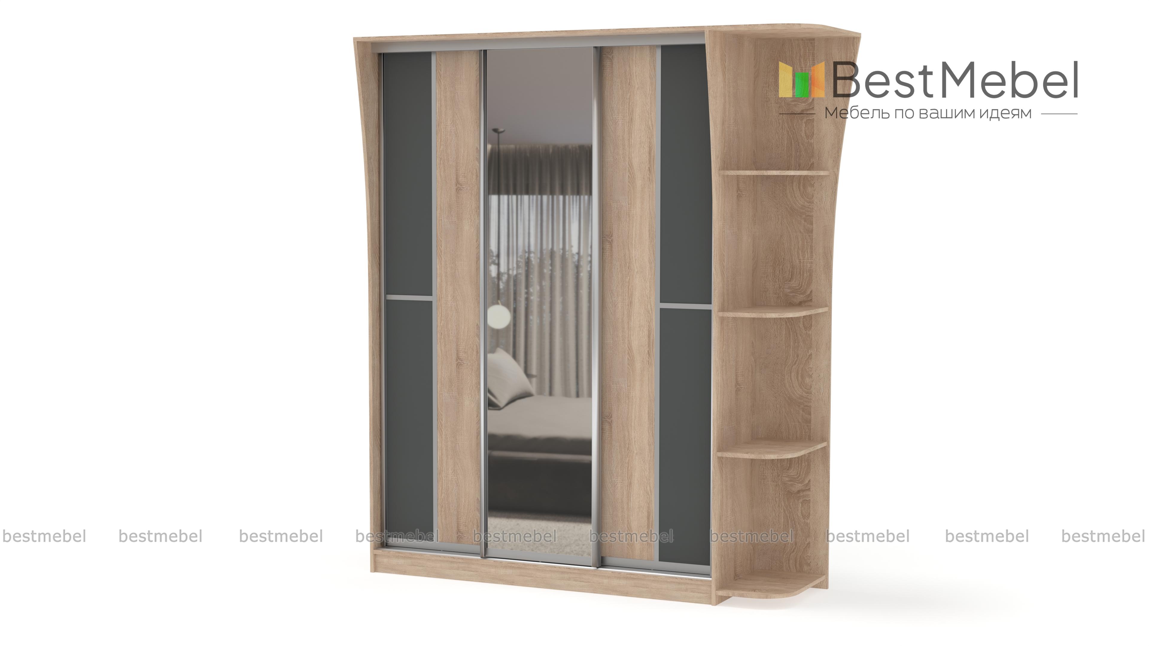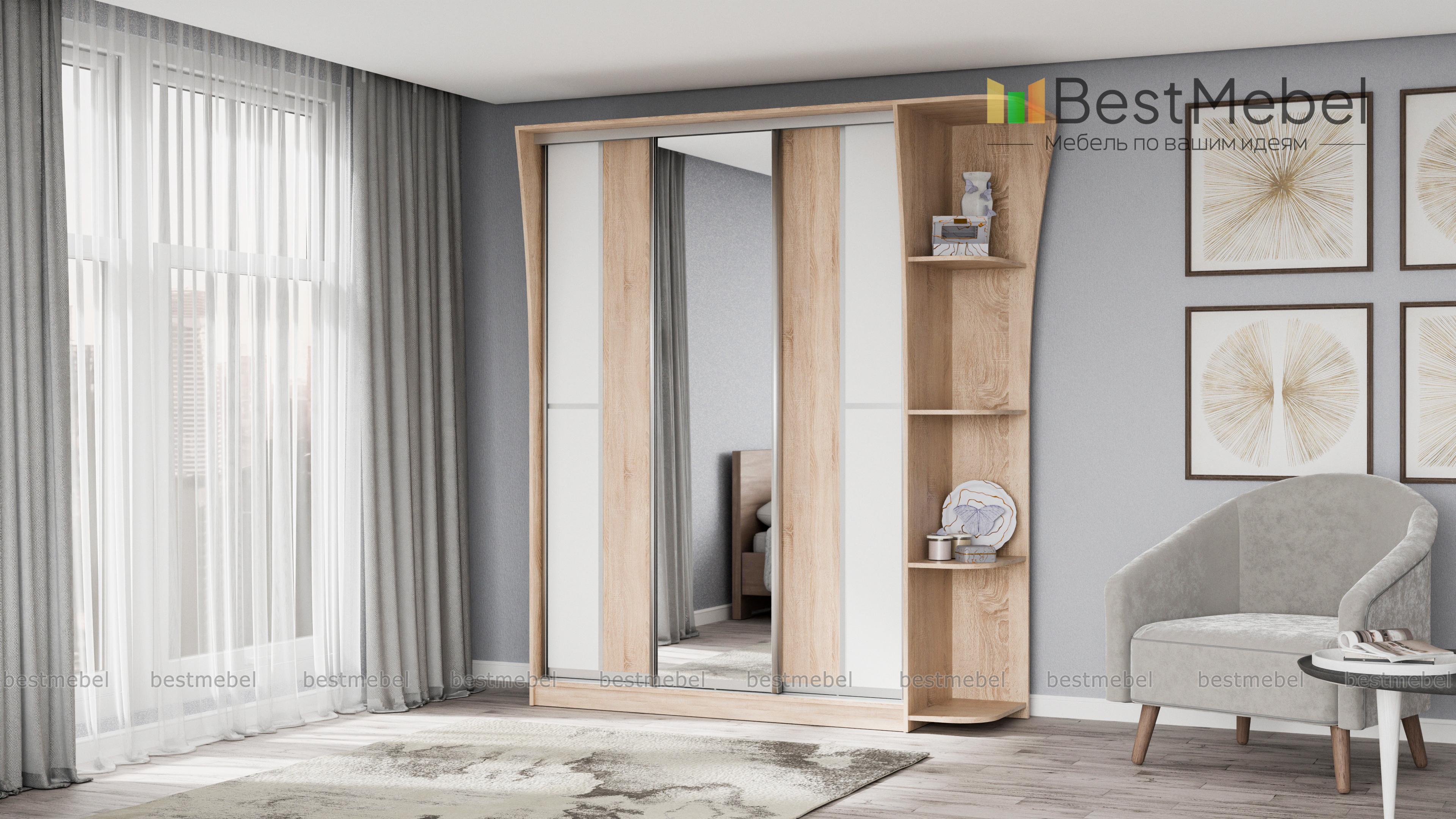 Если ищете вместительный шкаф в гостинную или спальню, Вам следует обратить внимание на шкаф-купе Концепт-14, с зеркальными дверьми по центру, платяным отделением со штангой для верхней одежды и полкой для головных уборов, бельевым отделом с вместительными полочками. Модель дополнена угловым открытым элементом, имеющим четыре полочки. Приобрести это изделие Вы можете в интернет-магазине, недорого.