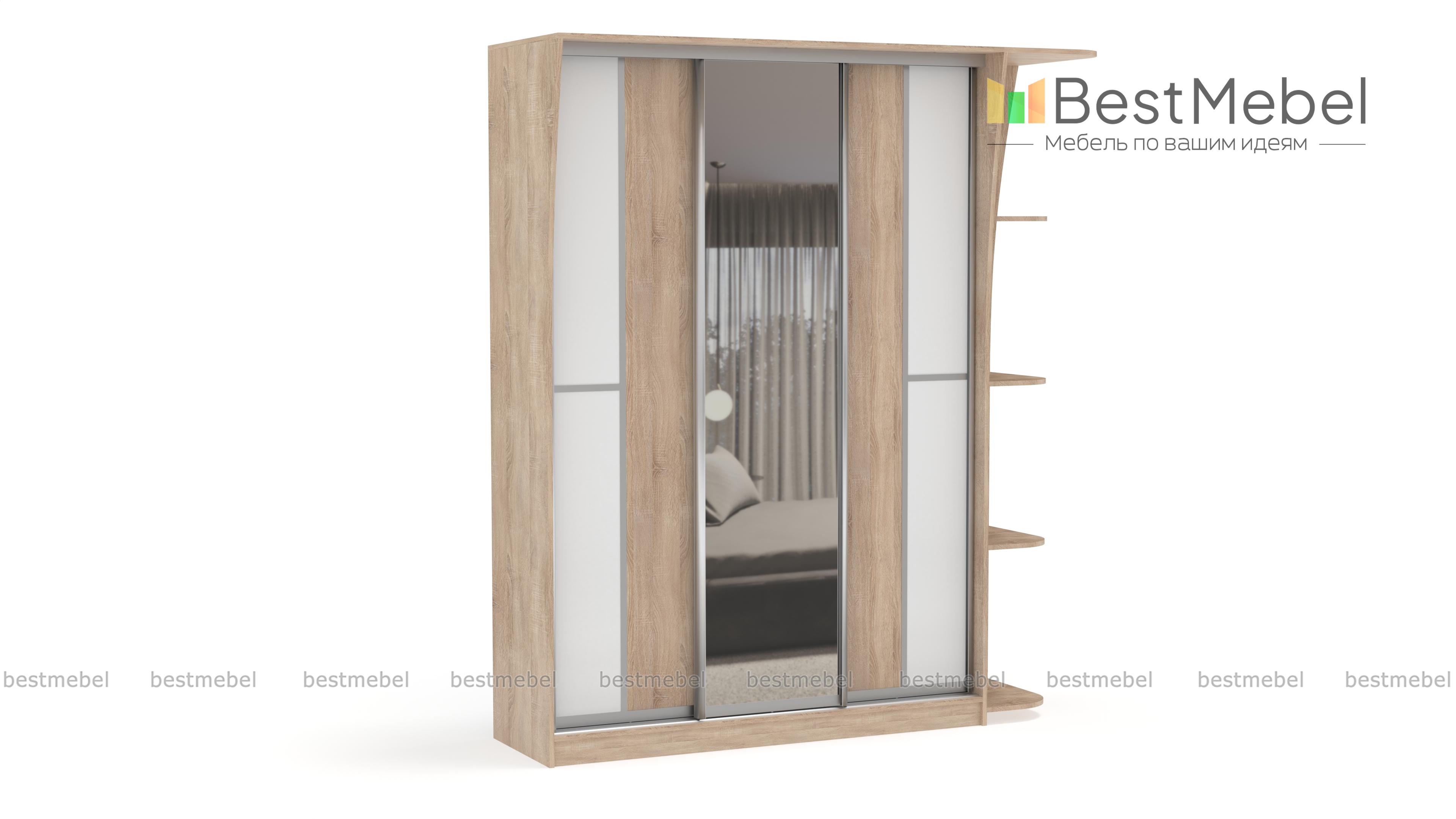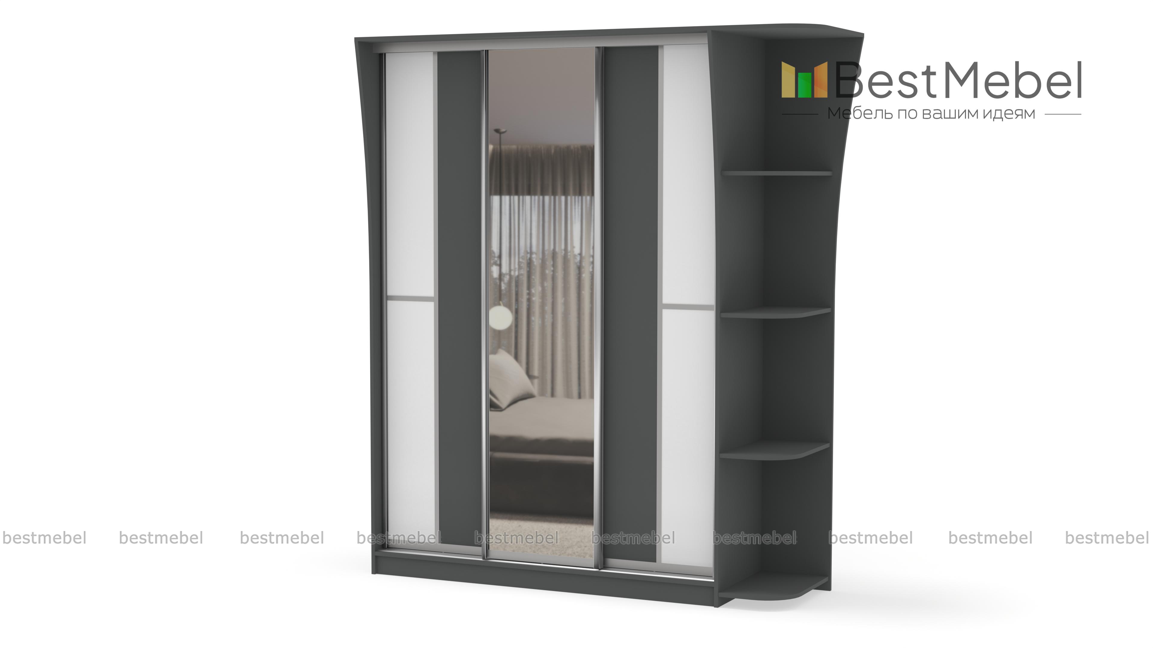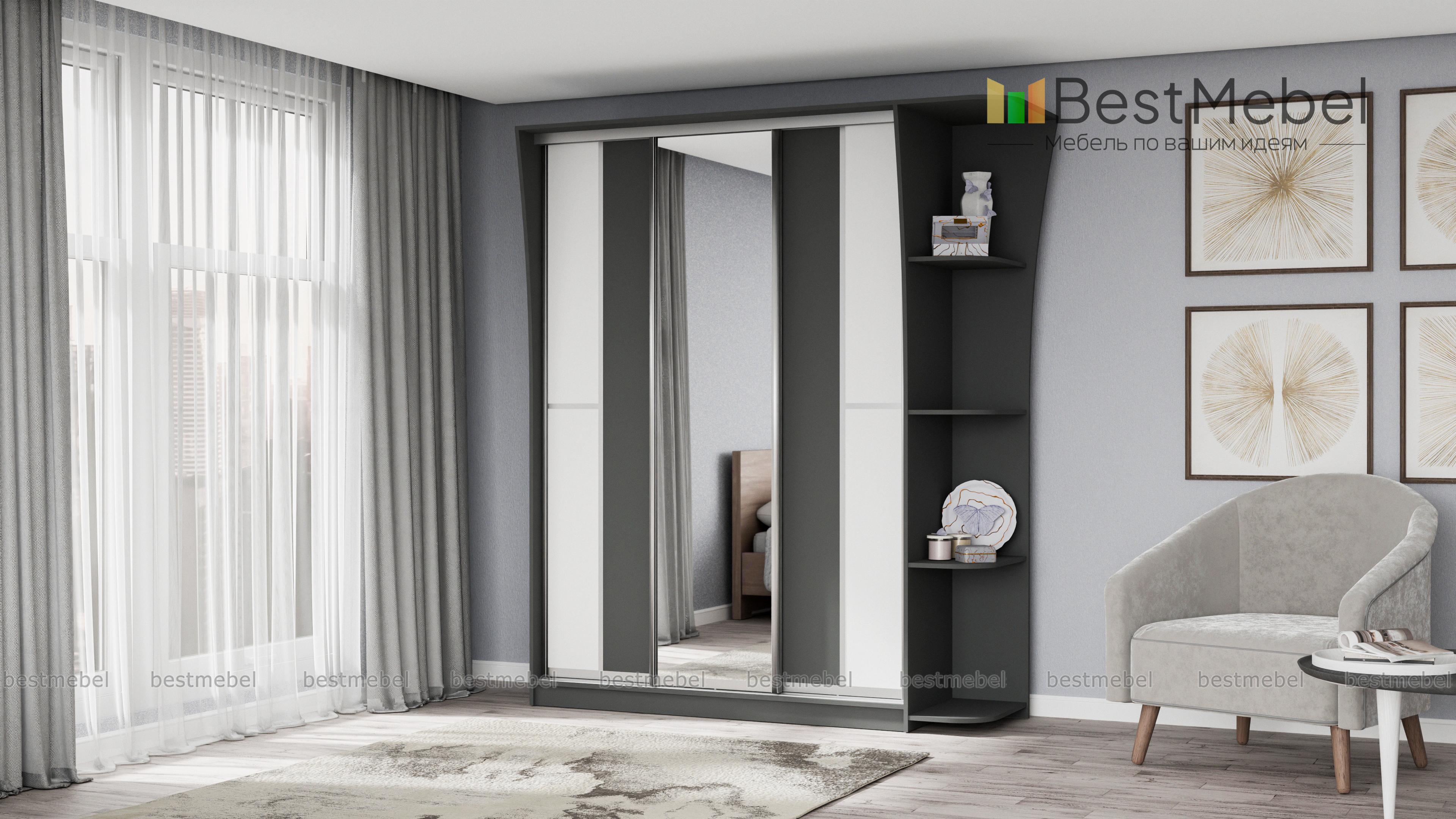 Если ищете вместительный шкаф в гостинную или спальню, Вам следует обратить внимание на шкаф-купе Концепт-14, с зеркальными дверьми по центру, платяным отделением со штангой для верхней одежды и полкой для головных уборов, бельевым отделом с вместительными полочками. Модель дополнена угловым открытым элементом, имеющим четыре полочки. Приобрести это изделие Вы можете в интернет-магазине, недорого.
