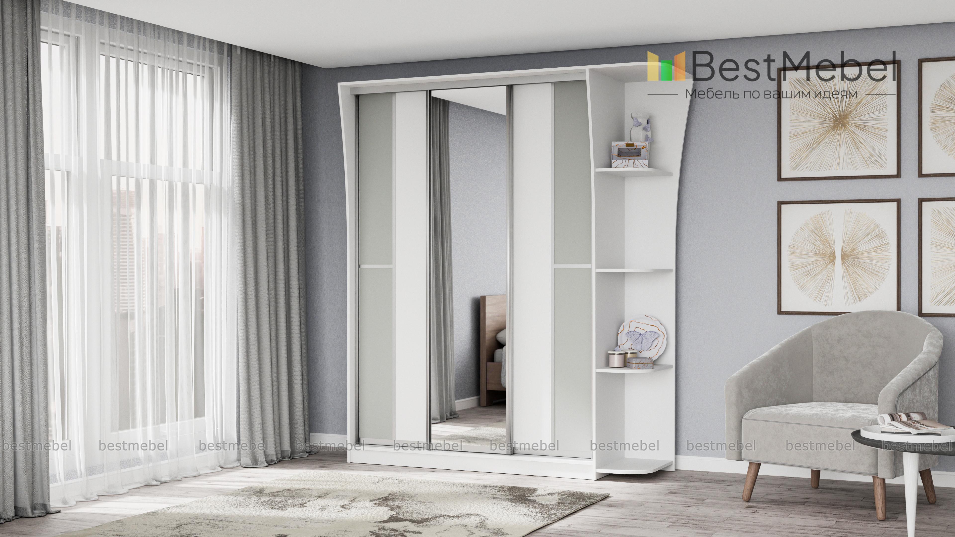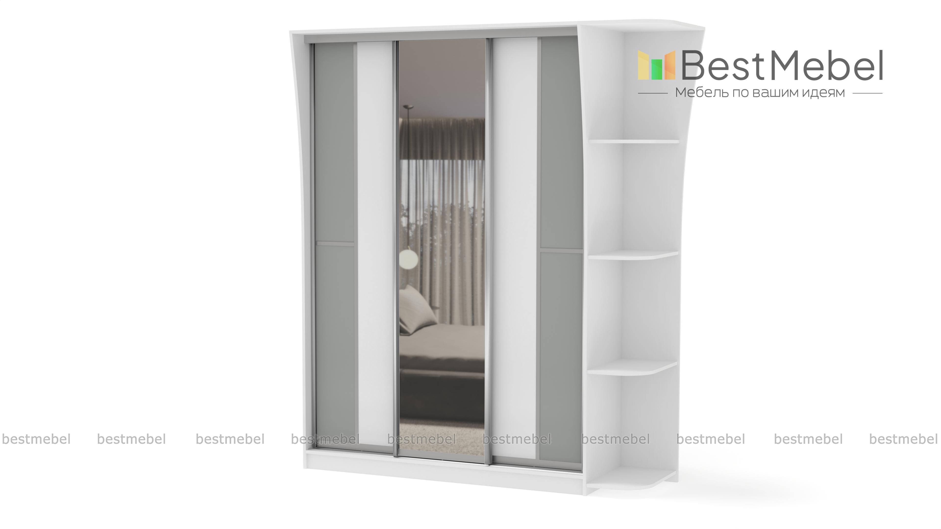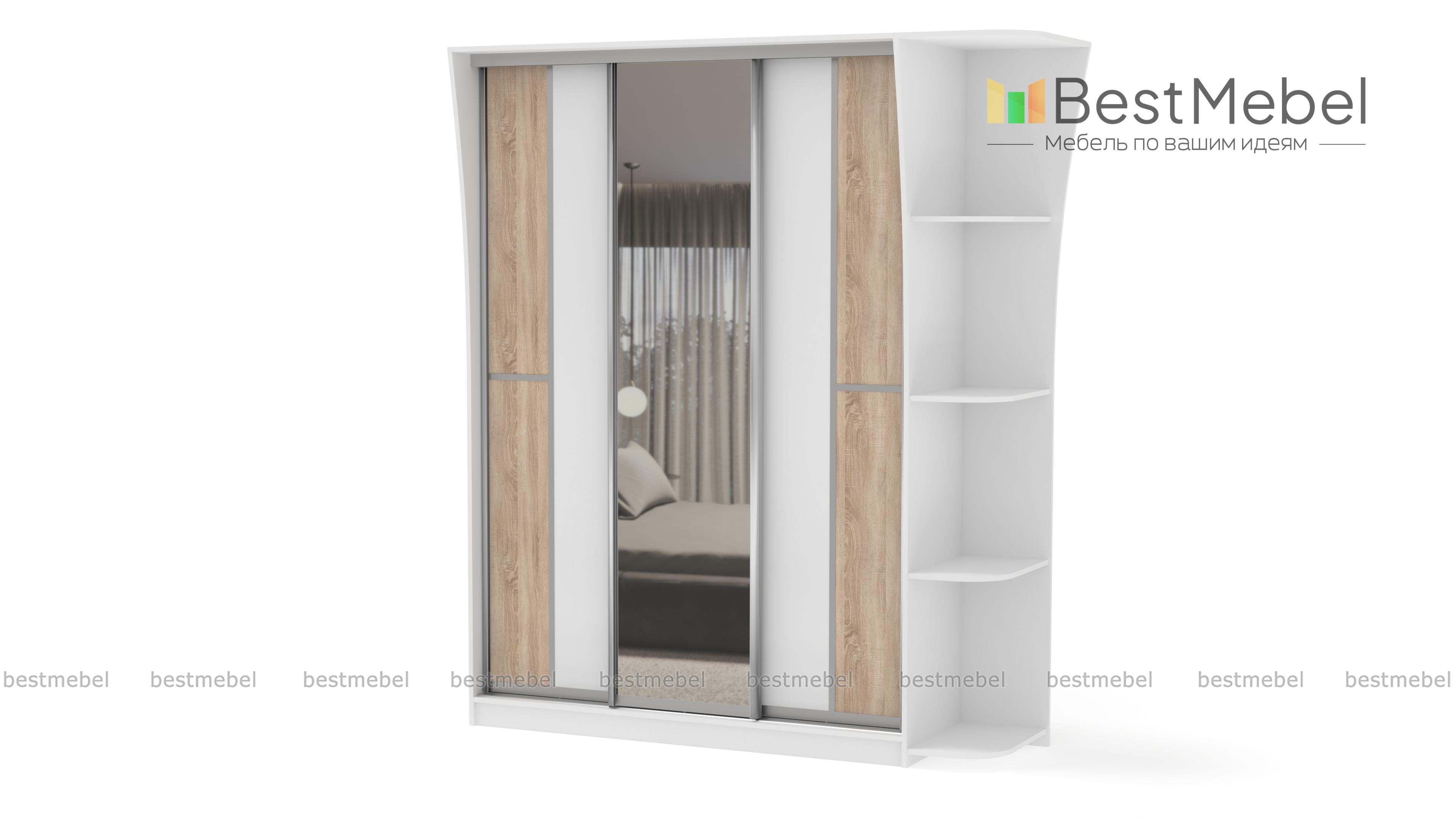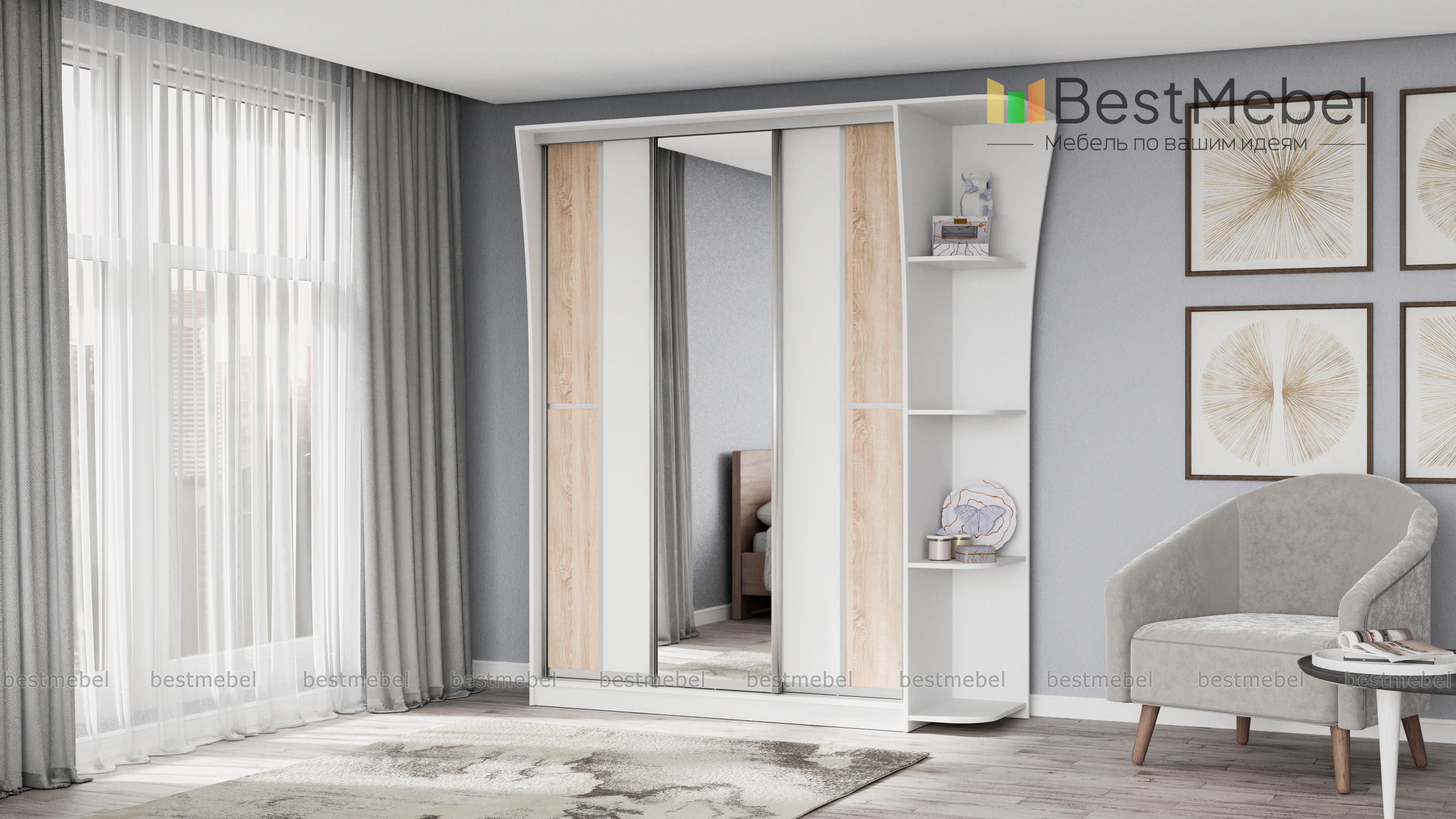 Если ищете вместительный шкаф в гостинную или спальню, Вам следует обратить внимание на шкаф-купе Концепт-14, с зеркальными дверьми по центру, платяным отделением со штангой для верхней одежды и полкой для головных уборов, бельевым отделом с вместительными полочками. Модель дополнена угловым открытым элементом, имеющим четыре полочки. Приобрести это изделие Вы можете в интернет-магазине, недорого.