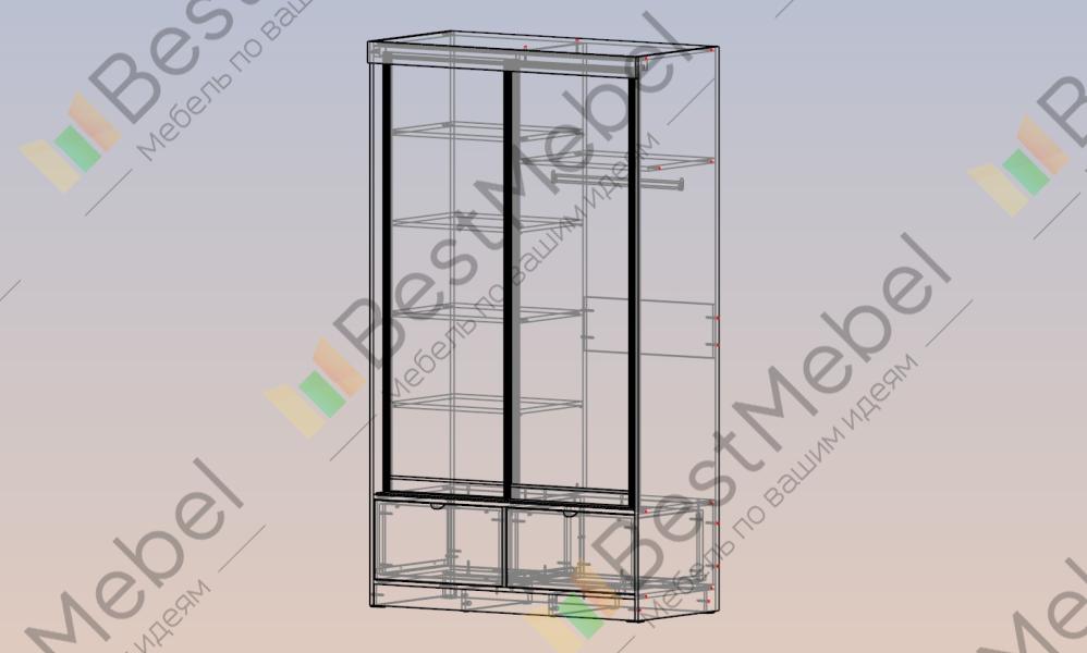 Конструкция шкафа-купе – это 5 глубоких ниш для одежды, 2 выдвижных ящика для обуви и разных мелочей и просторное отделение со штангой. Мебель оснащена алюминиевыми ручками, предотвращающими коробление двери. А качественная фурнитура и раздвижная система обеспечивает легкую и бесшумную эксплуатацию.