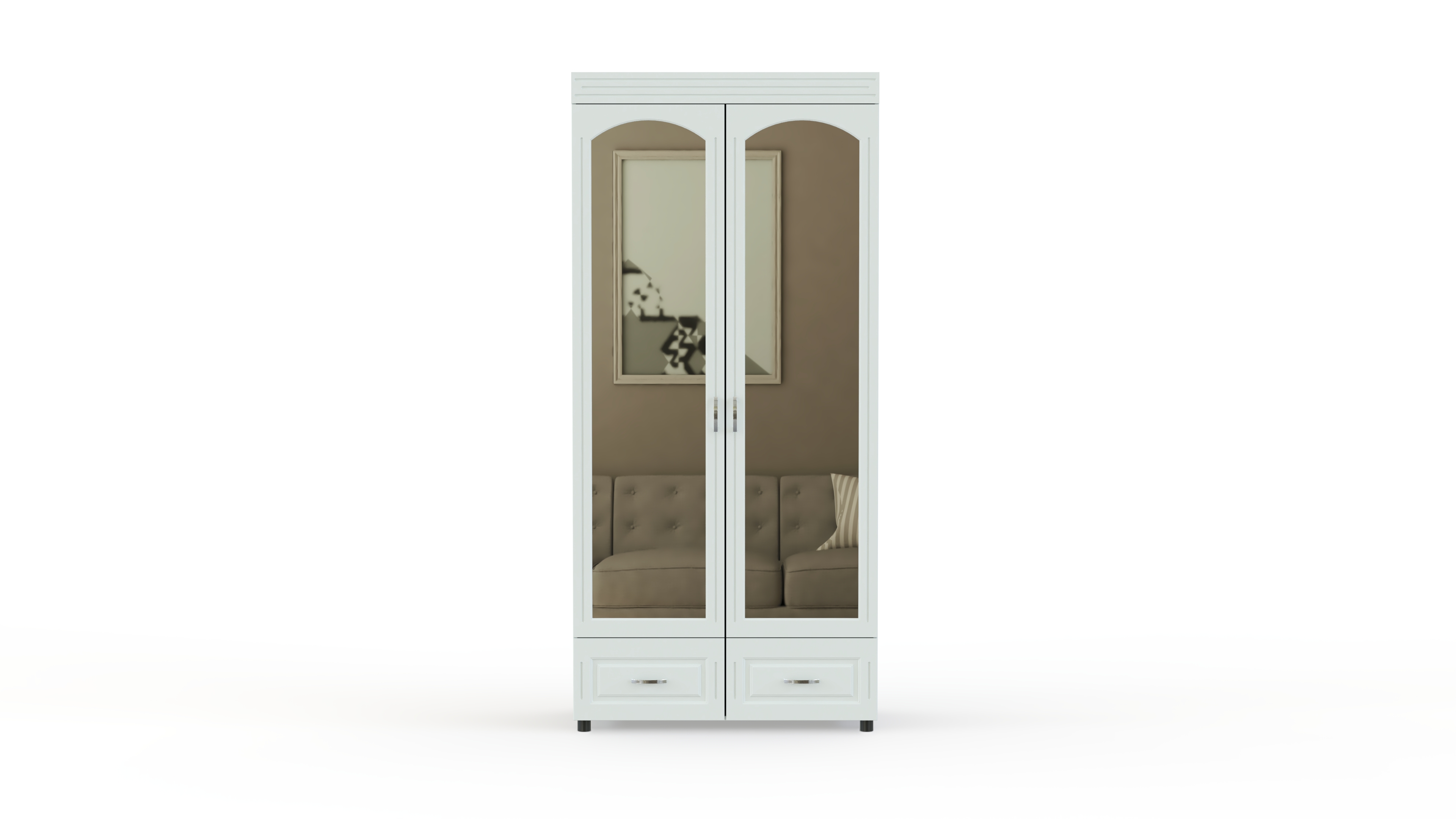 Элегантный классический комплект для спальни Элизабет Композиция 3 BMS, выполненный в светлых тонах, выглядит особенно легко и атмосферно и станет в интерьере вашего дома стильным акцентом. В гарнитур входят платяной шкаф с изящными полукруглыми зеркалами, туалетный столик с навесным широким зеркалом, удобная двуспальная кровать и две прикроватные тумбы. Фасады мебели декорированы металлическими, под позолоту, оригинальными ручками, придающими всему комплекту винтажный оттенок.
