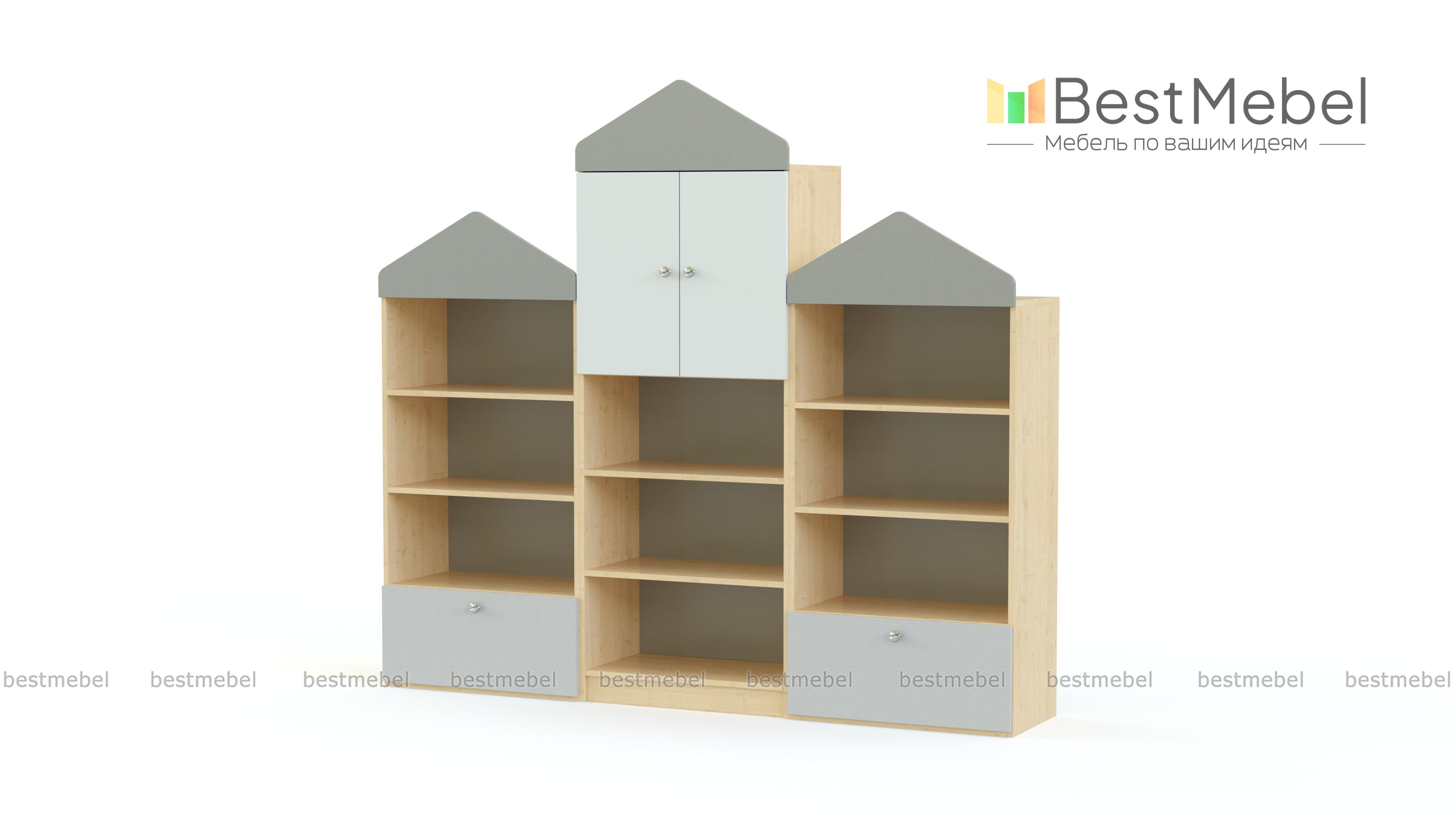 Стеллаж Борн 12 BMS состоит из трех модулей с вырезанными в виде крыши декоративными элементами. Красочная стенка, оборудованная открытыми полками, выдвижными ящиками и двухдверным распашным отделением, станет прекрасным выбором для меблировки дошкольных учреждений. Модель не только поможет разместить игрушки, книги и обучающие материалы, но и создать комфортный для малышей, уютный интерьер. Купить стеллаж Борн 12 BMS приглашаем в наш интернет-магазин с возможностью изготовления по индивидуальным размерам.