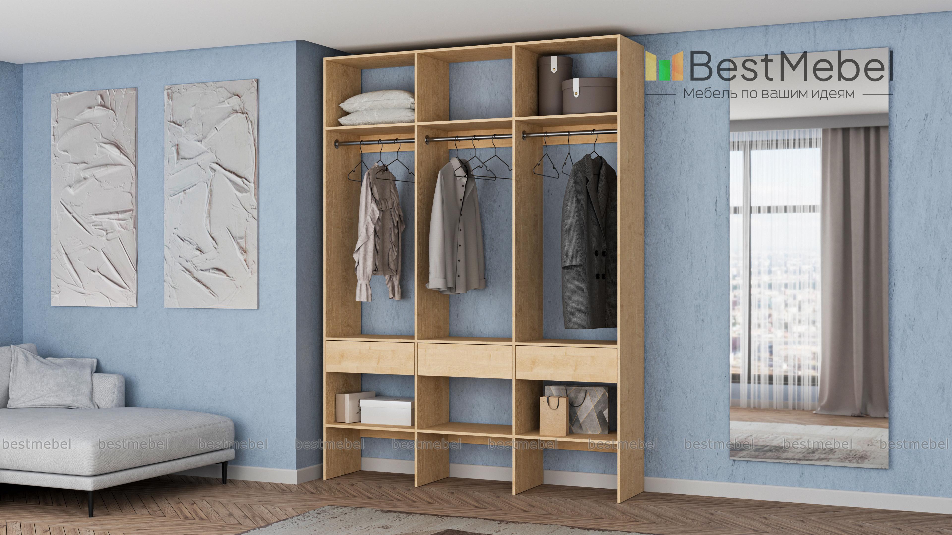 Стеллаж для одежды Мирта 51 BMS — визуально легкая и надежная конструкция из ламинированной ДСП, которую легко вписать в интерьер. Трехсекционный стеллаж прекрасно подходит для современных прихожих и гардеробных. Для вашего удобства три бельевых ящика и обувные полки располагаются снизу, а пространство над штангами занято полками для редко используемых вещей. Купить стеллаж для одежды Мирта 51 BMS вы сможете на сайте нашего интернет-магазина, подобрав цвет и размеры.