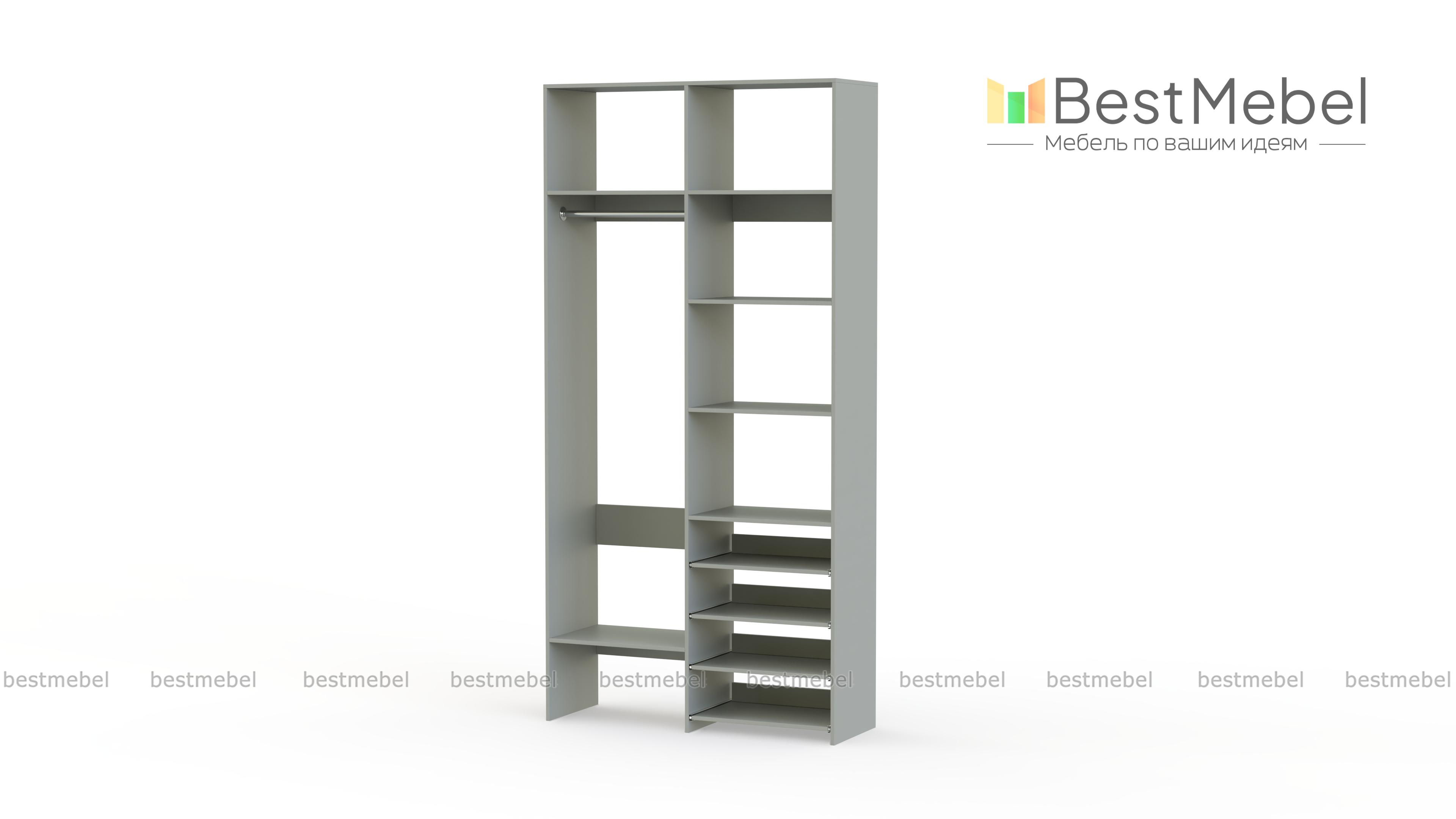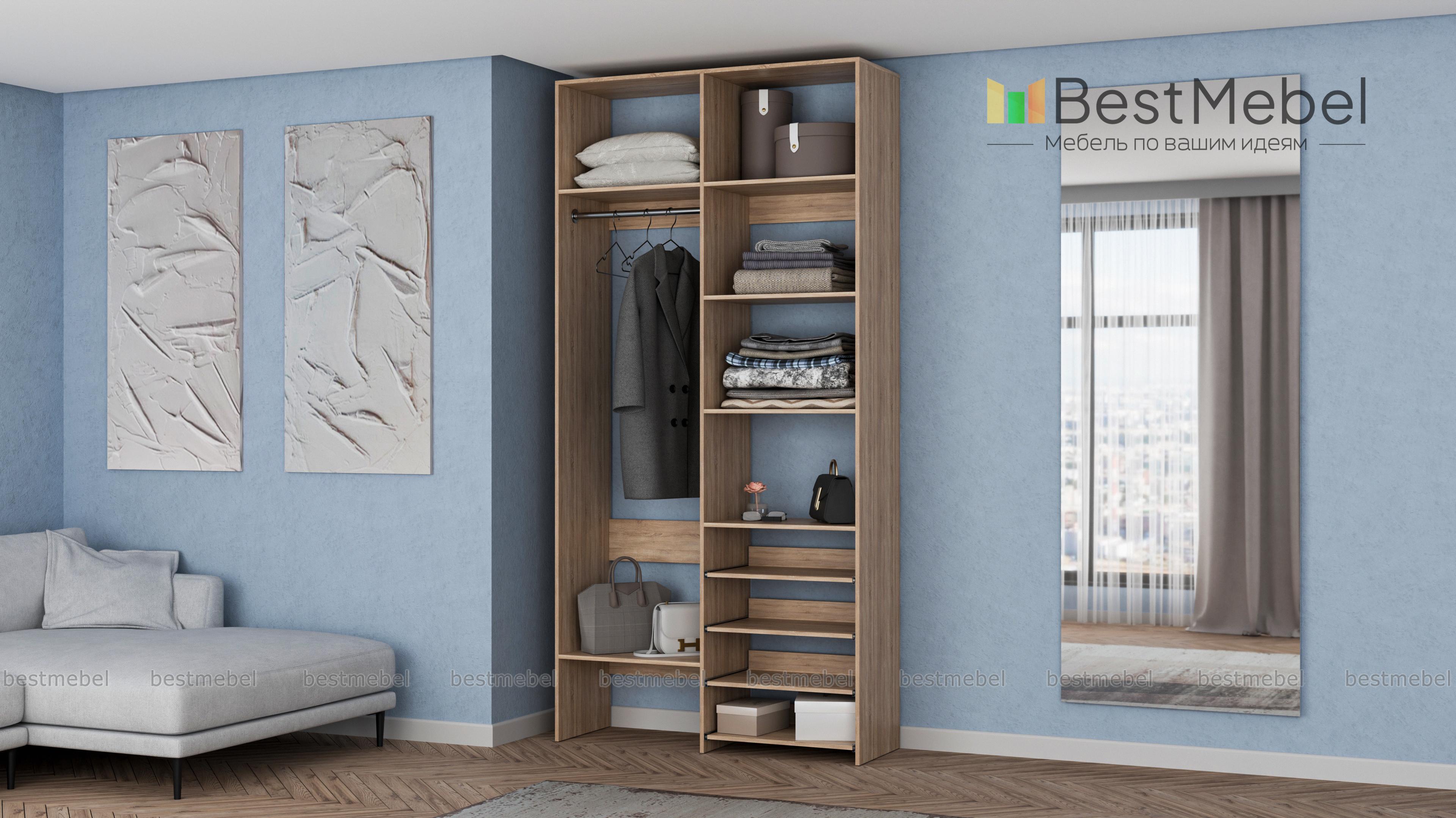 Стеллаж для одежды Мирта 79 BMS подойдет вам, если вещей немного. Компактная по ширине конструкция оборудована не только штангой для вешалок и стандартным набором бельевых полок, но и четырьмя выдвижными панелями. В нейтральном природном оттенке стеллаж выглядит современно, а простая форма хорошо вписывается в пространство. Купить стеллаж для одежды Мирта 79 BMS, изготовленный по индивидуальным размерам, вы всегда сможете на сайте нашего интернет-магазина.