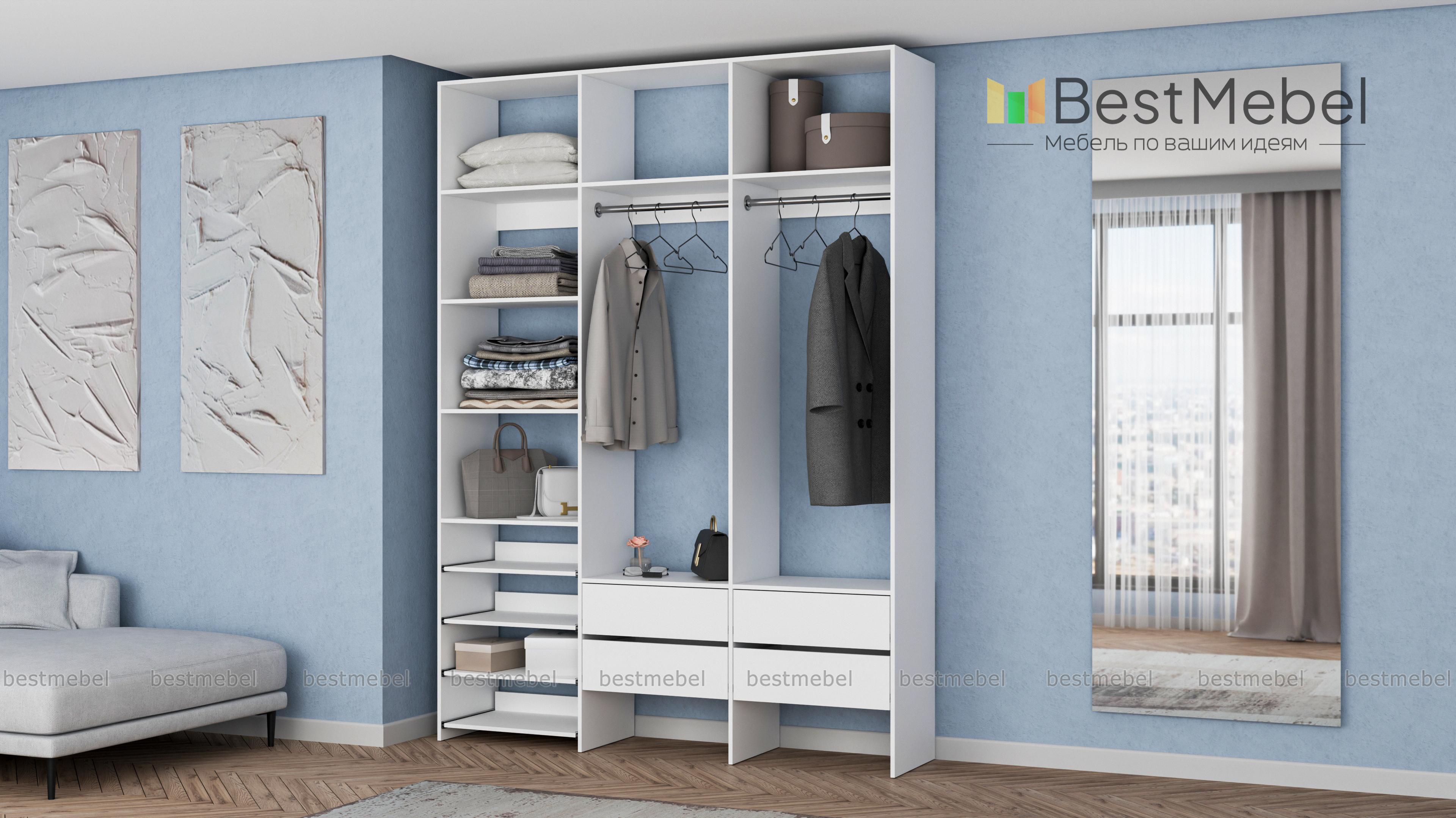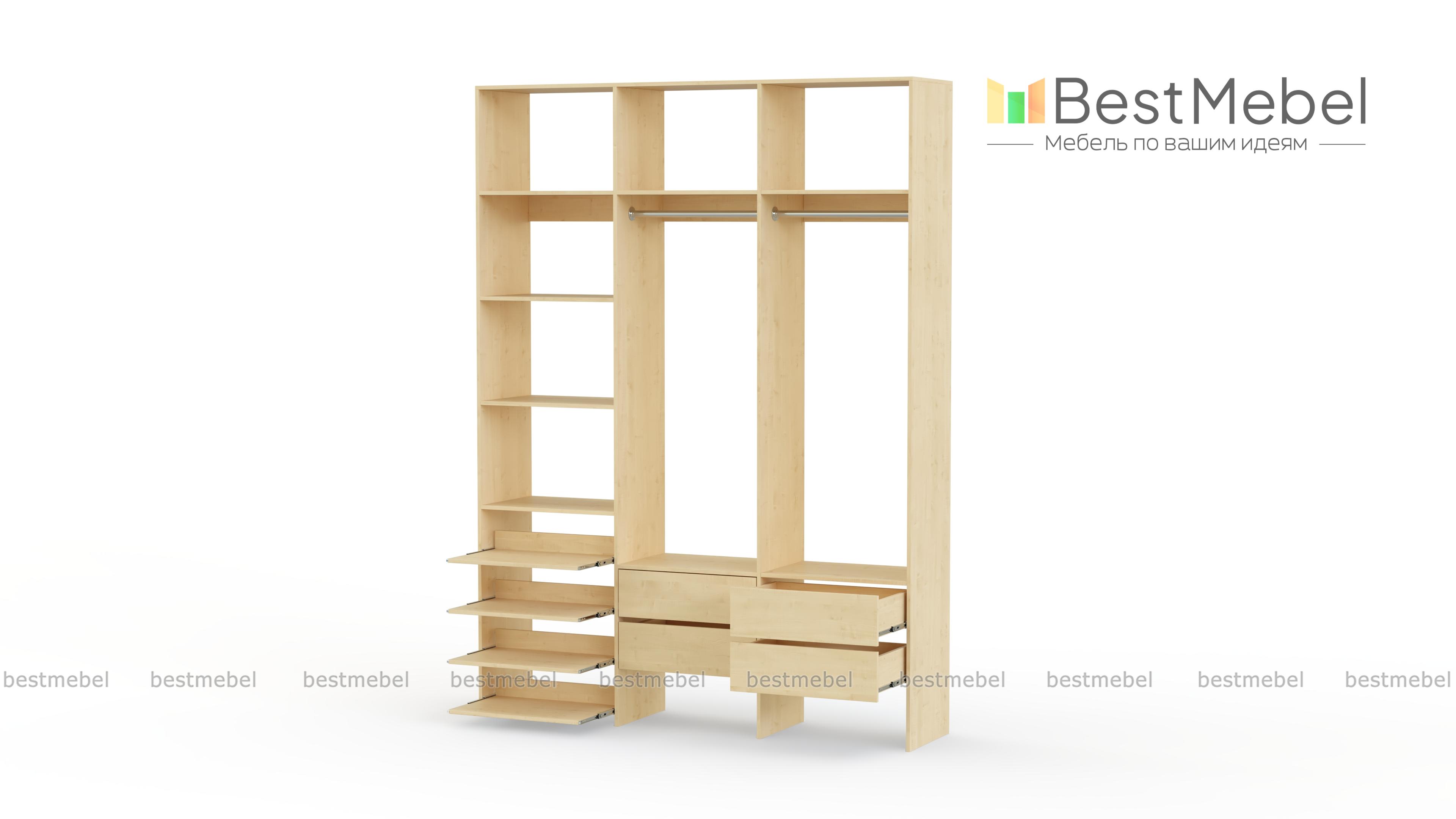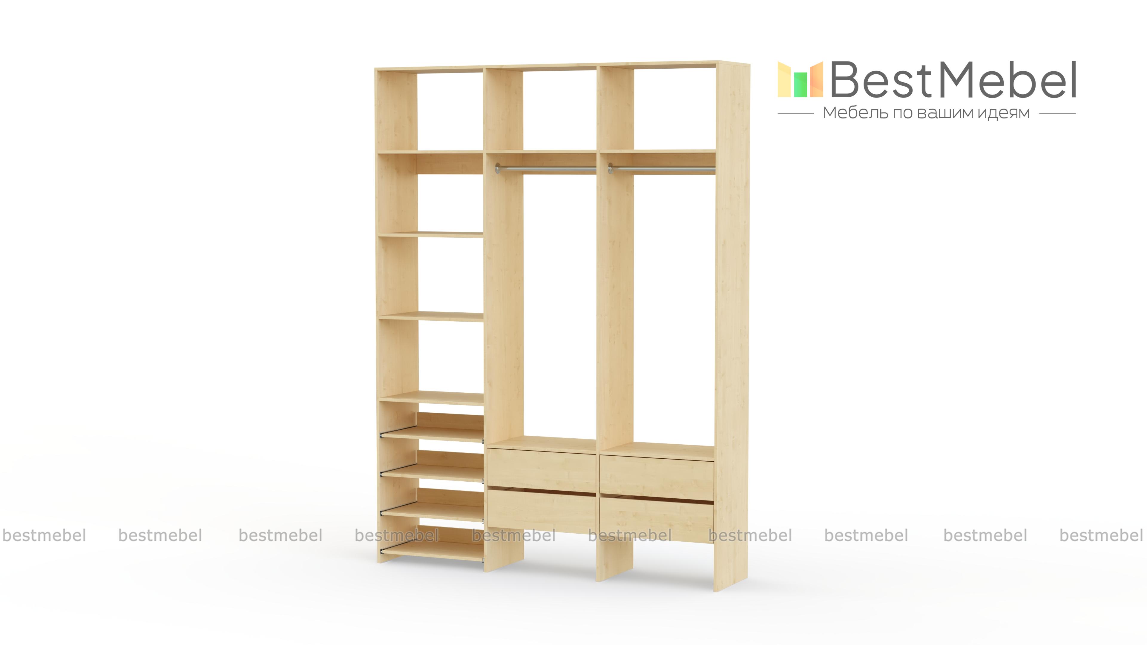 Стеллаж для одежды Мирта 98 BMS поможет вам организовать пространство в прихожей или гардеробной. Открытая система хранения включает в себя две платяные штанги, под которыми располагаются четыре ящика для мелочей, ряд выдвижных полок и стандартные бельевые. Прочная ламинированная ДСП, из которой изготовлен стеллаж, способна выдерживать большие нагрузки. Купить стеллаж для одежды Мирта 98 BMS, выполненный по индивидуальным размерам, приглашаем в наш интернет-магазин.