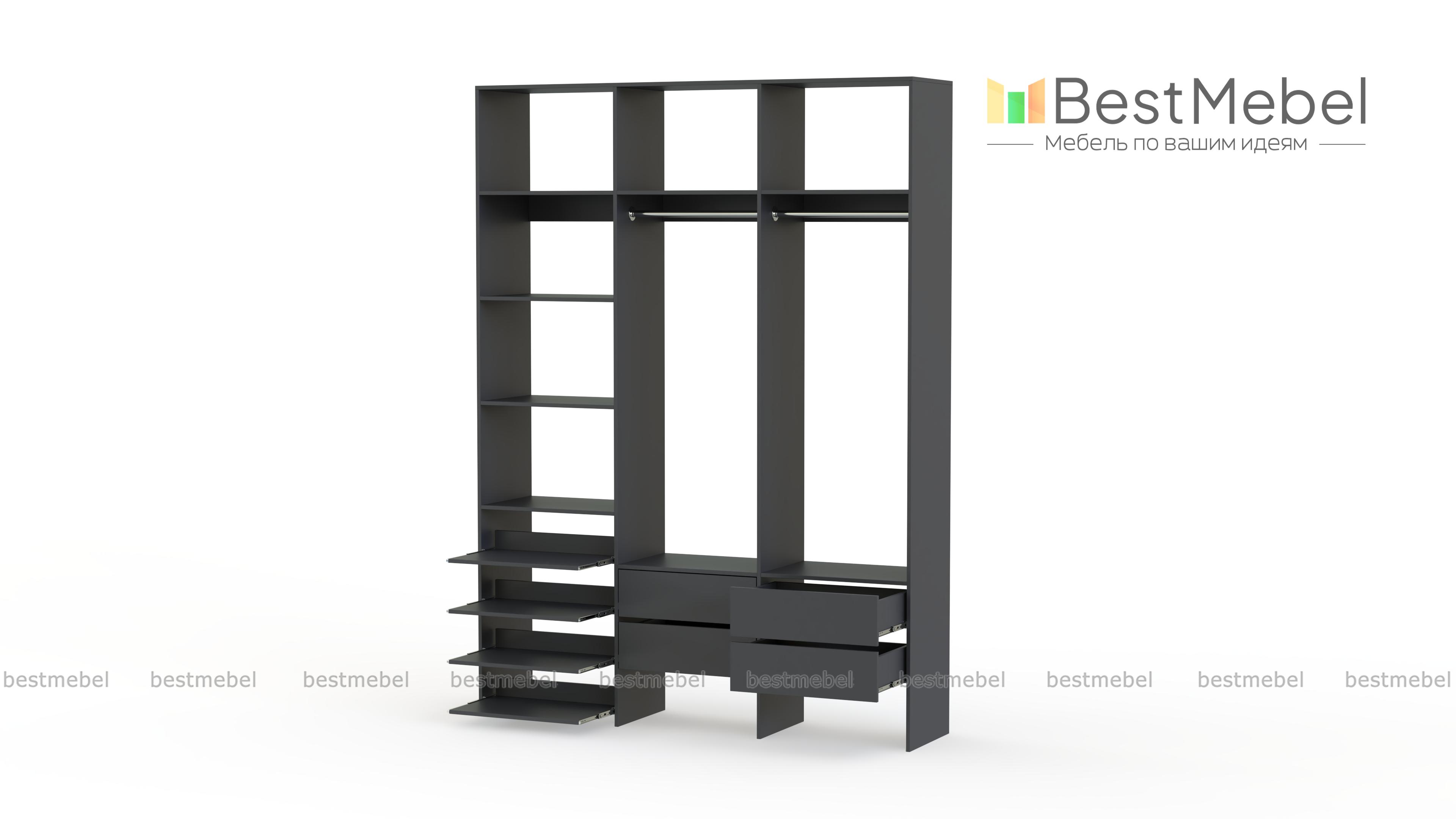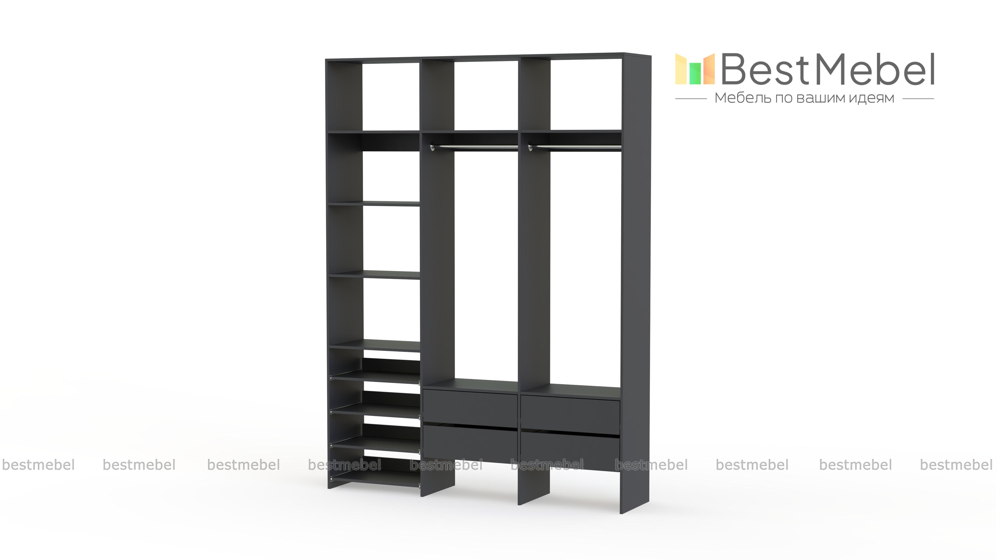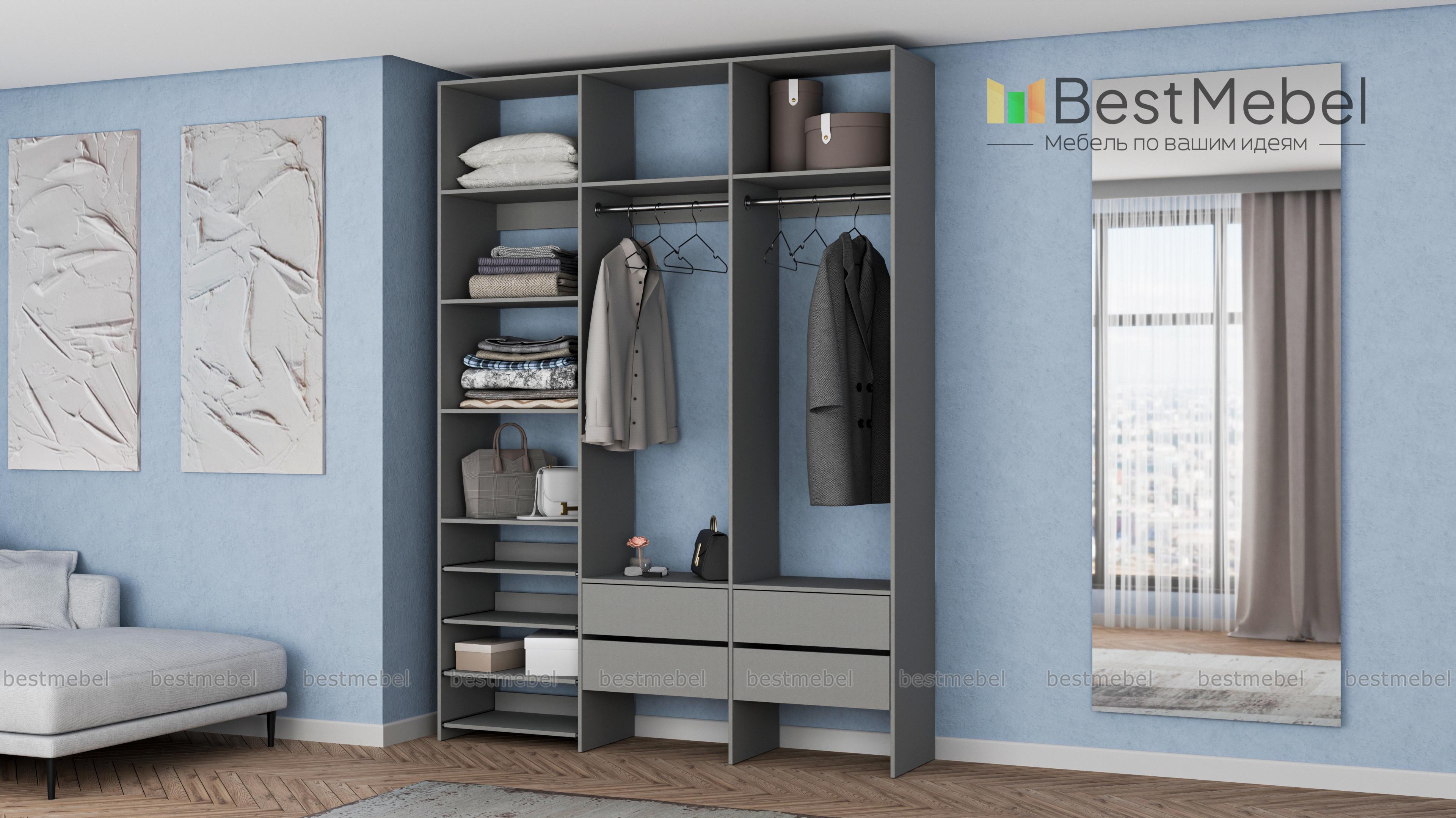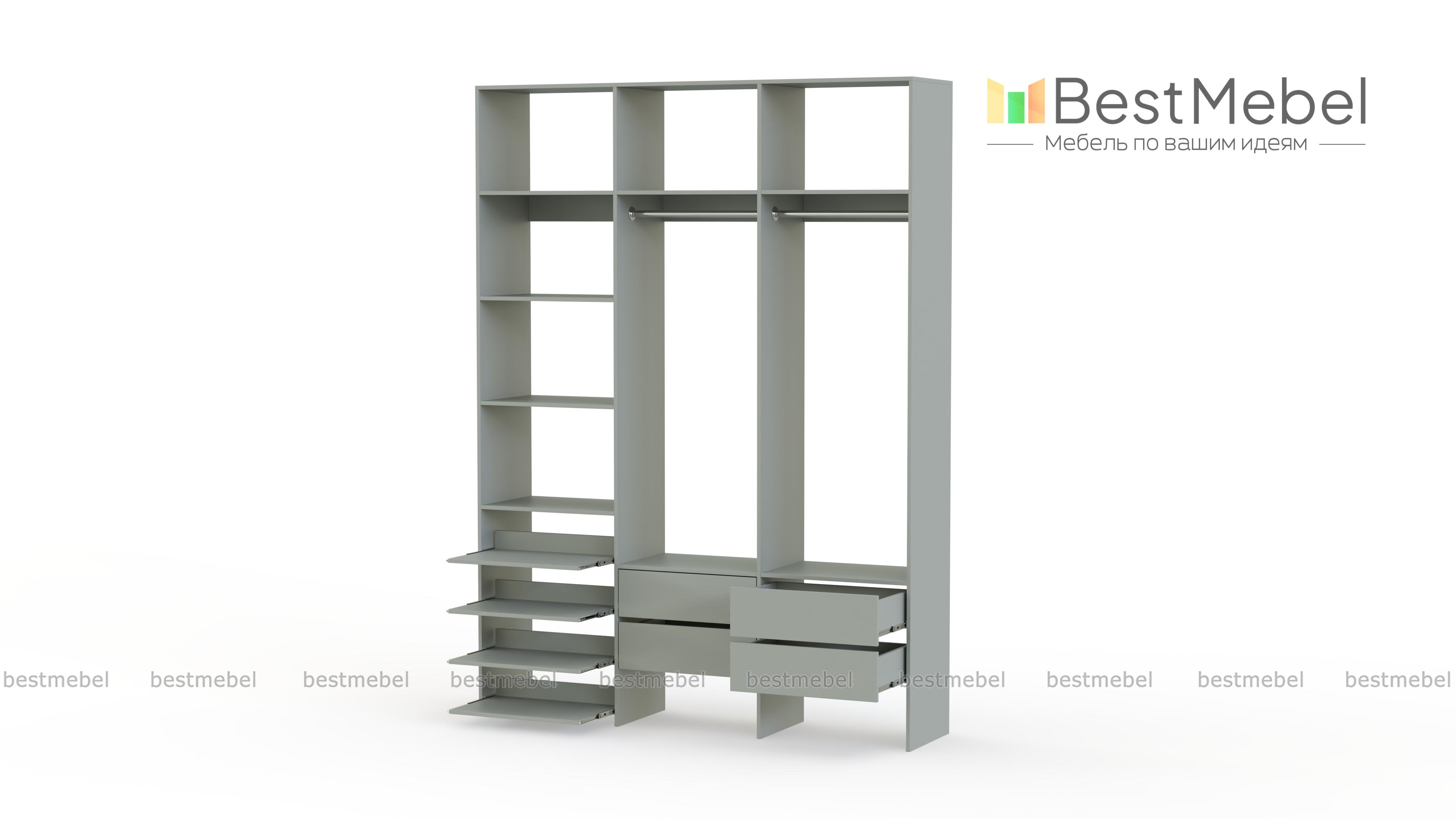 Стеллаж для одежды Мирта 98 BMS поможет вам организовать пространство в прихожей или гардеробной. Открытая система хранения включает в себя две платяные штанги, под которыми располагаются четыре ящика для мелочей, ряд выдвижных полок и стандартные бельевые. Прочная ламинированная ДСП, из которой изготовлен стеллаж, способна выдерживать большие нагрузки. Купить стеллаж для одежды Мирта 98 BMS, выполненный по индивидуальным размерам, приглашаем в наш интернет-магазин.