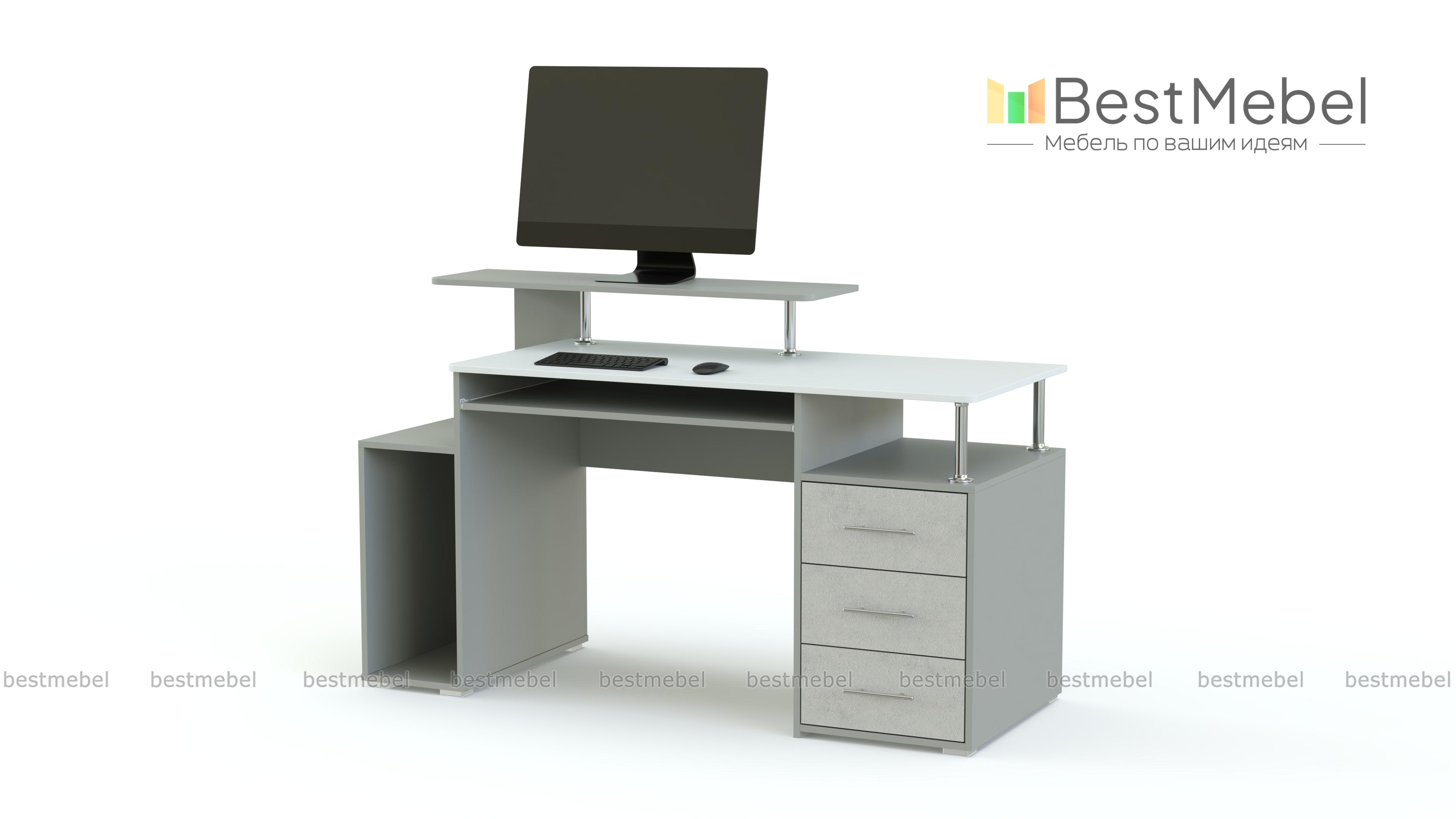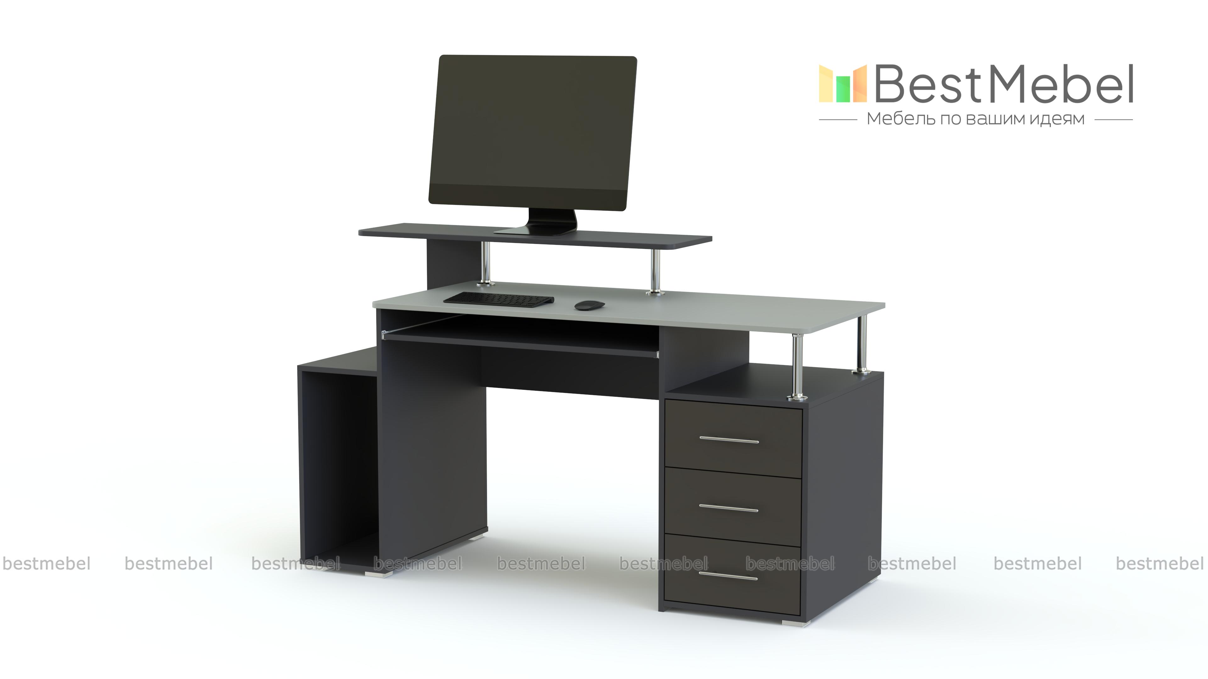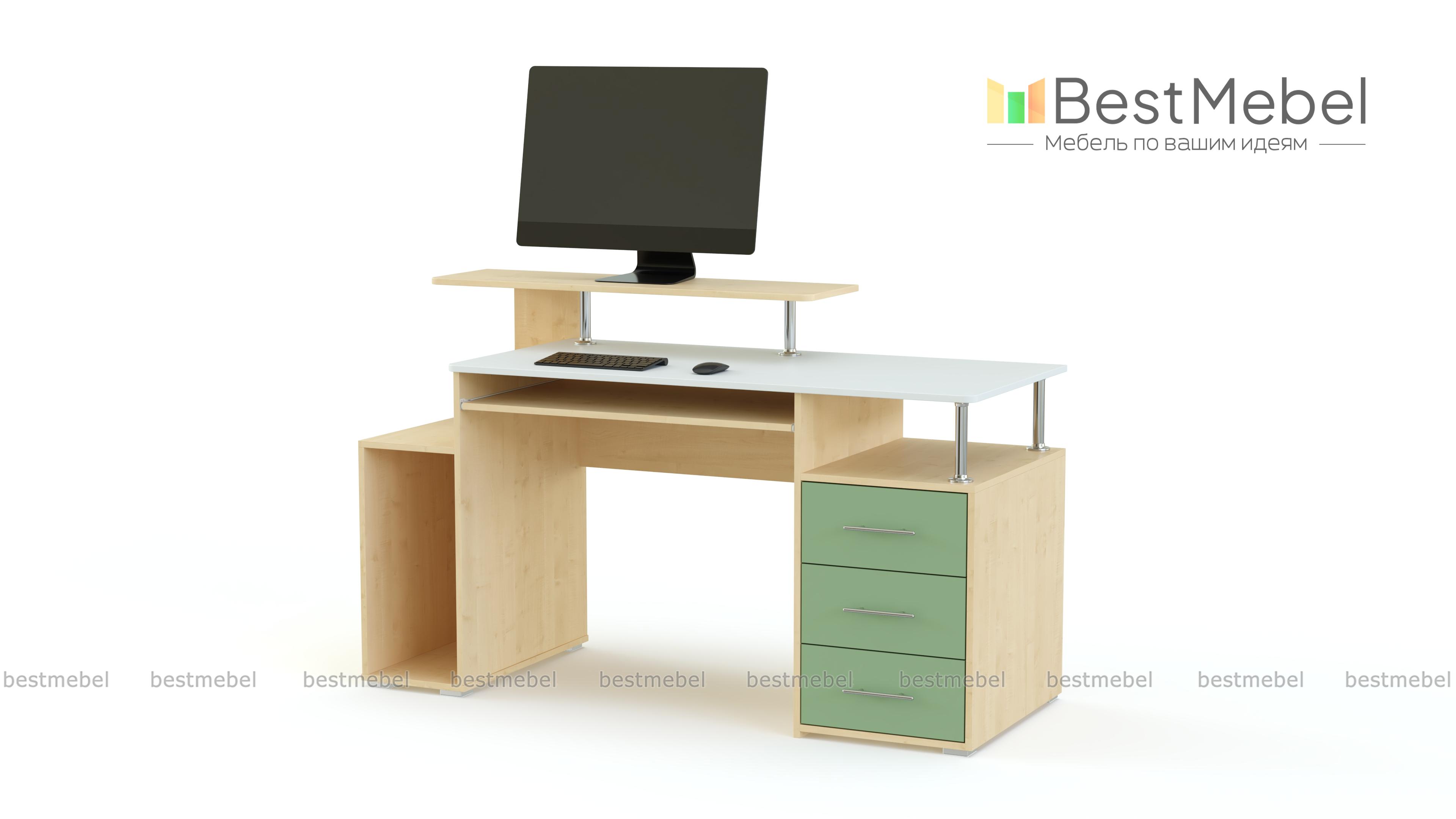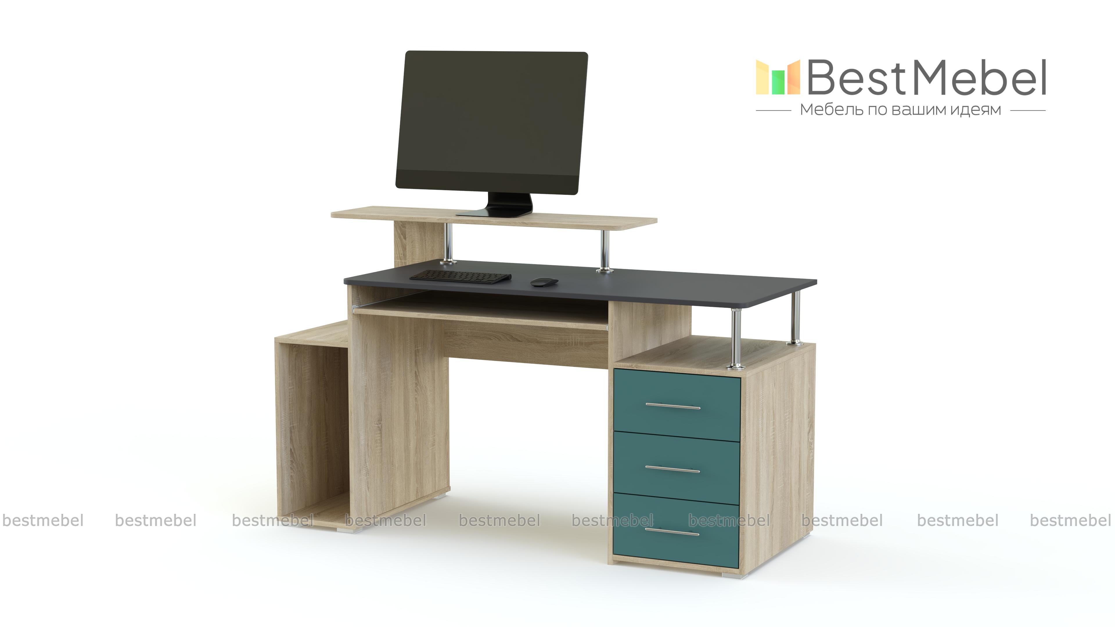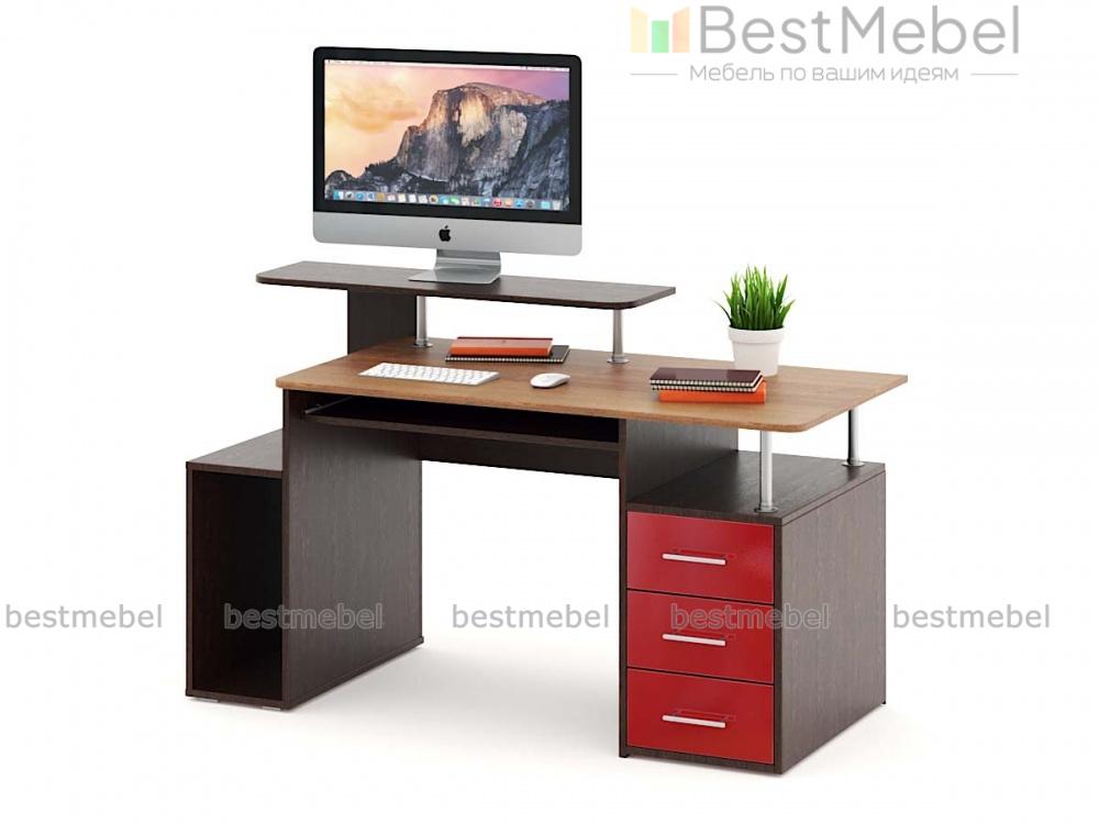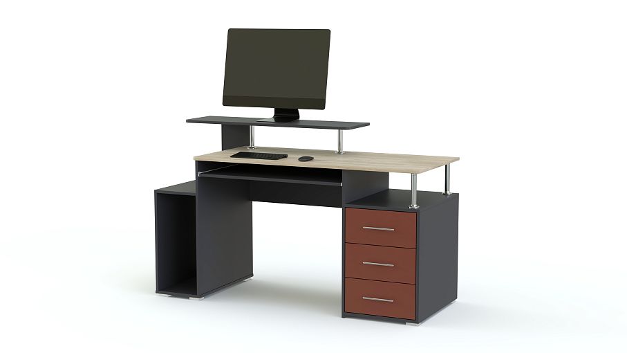 Компьютерный стол МБ 14.1 BMS станет эффектным дополнением стильного офиса или современного домашнего интерьера. Визуально легкая и вместительная, модель оборудована просторной столешницей с выдвижной полкой для клавиатуры, отделением под системный блок, тумбой с выдвижными ящиками и нишей и оригинальной подставкой для монитора. В оформлении сочетаются древесные тона, терракотовый оттенок фасадов и хромированные элементы. Купить компьютерный стол МБ 14.1 BMS приглашаем по лучшей цене в наш интернет-магазин.