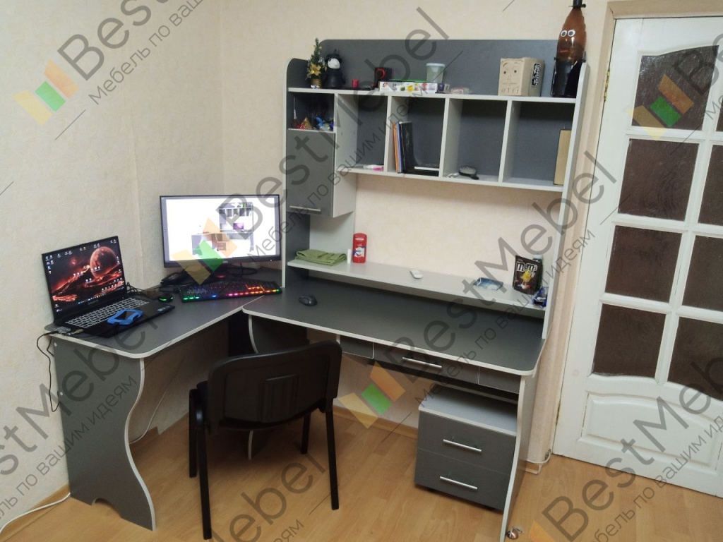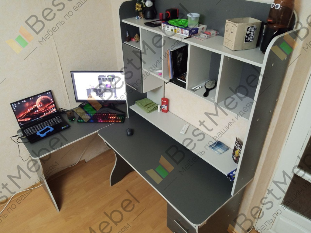 Лучший стол, который нашел для себя на сайте. При заказе попросил его видоизменить под себя. Кромка 0,4 добавил, цвет дуб молочный, цвет кромки Орех Гварнери. Ширину основного стола увеличил до 1100мм, ширину доп стола уменьшил до 300мм. Верхотуру сделал шириной в оба стола. Ящик на верхотуре поднял вровень с остальными полками. Выдвижной ящик под столом убрал, добавил туда выдвигающую полку для клавиатуры. Плюс ответстия для проводов. Сборщик собрал за час. Получился отличный стол, идеально под себя.