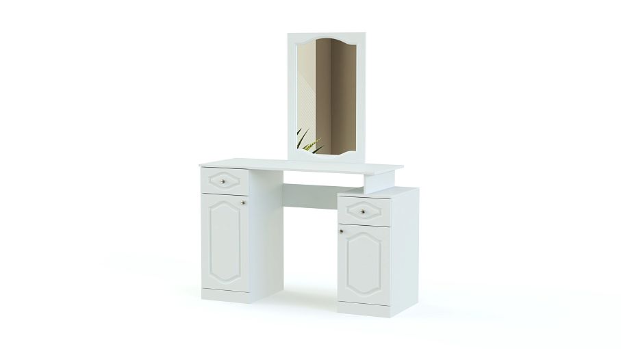 Стол макияжный Арина-2 BMS может использоваться как самостоятельный предмет интерьера или в комплекте с другими модулями классической серии для спальни. Двухтумбовый столик оборудован просторной столешницей, зеркалом в раме, выдвижными ящиками и распашными отделениями с полками для хранения под рукой уходовых средств, украшений и аксессуаров. Выполненная в универсальных белых тонах, модель декорирована по фасаду фрезеровкой. Купить стол макияжный Арина-2 BMS для комфортного ухода за собой приглашаем в наш интернет-магазин.